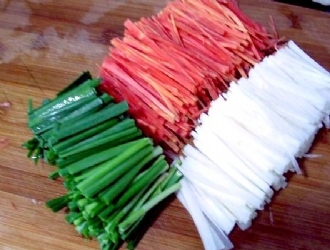 此外还要准备大一点的胡萝卜1根,白萝卜1个切个5厘米长的丝,韮菜切成5厘米长的段,上图。