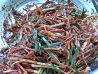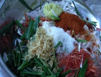 然后再把几种丝加上洋葱碎,姜蒜碎,多一点比较好,虾皮,鸡精,白糖,蜂蜜。少量的盐,和不是很辣的细辣椒粉,如果能吃辣的话再加点中粗的辣椒粉,具体用量可以按照自己的口味自主搭配。